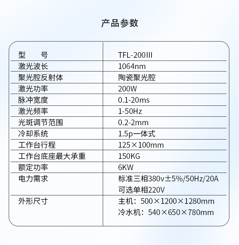 TFL-200Ⅲ型模具激光焊機是通發(fā)激光公司在TFL-180Ⅲ的基礎(chǔ)進行了改良,采用通發(fā)自主研發(fā)的二代精密單燈電源為燈泵浦驅(qū)動電源,配置觸摸屏,操作更方便。主機具備激光頭手搖升降與工作臺按鈕電動升降實現(xiàn)焊接不同厚度模具的激光焊加工。本款機型更適用于各類高精密注塑模具激光補焊,精密塑膠模具零件激光修補,塑膠模具鈹銅零件激光燒焊;可對模具使用過程中出現(xiàn)的磨損進行激光修復(fù);對機械加工失誤、電火花加工失誤,模具減膠設(shè)計變更等需要對模具修改,起到關(guān)鍵的作用,可彌補因加工失誤造成的巨大損失。