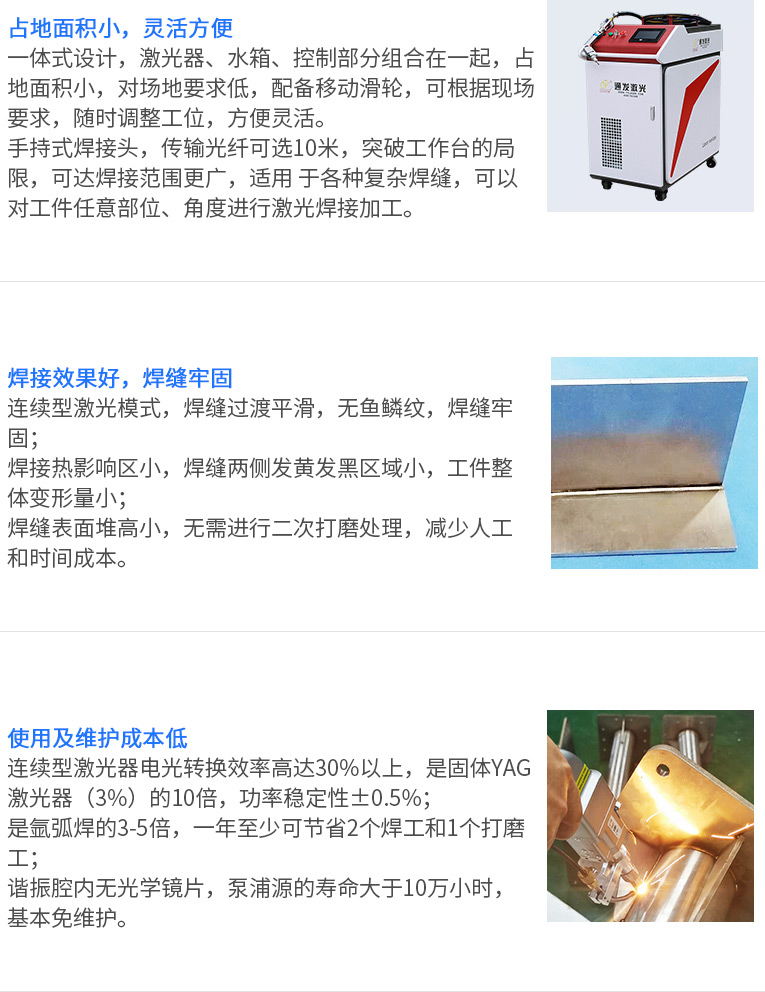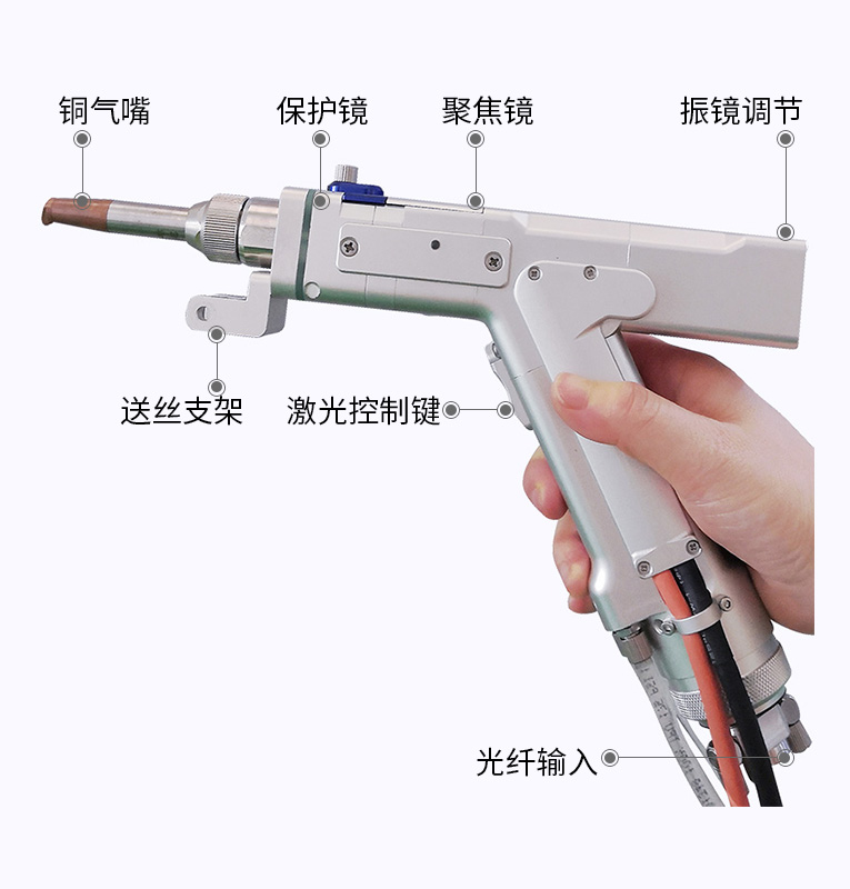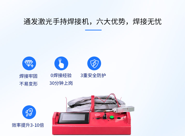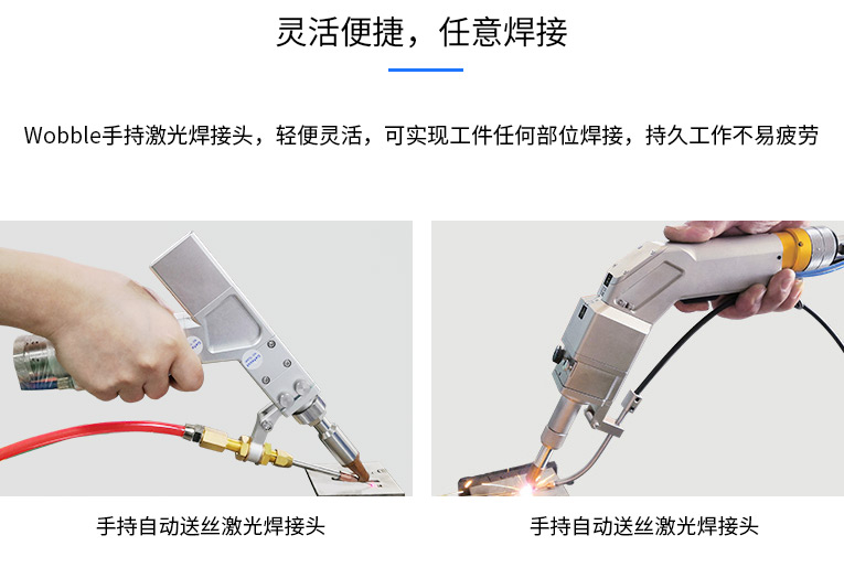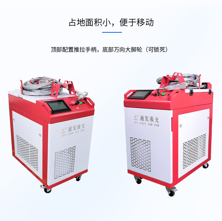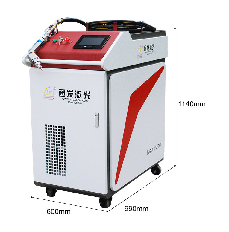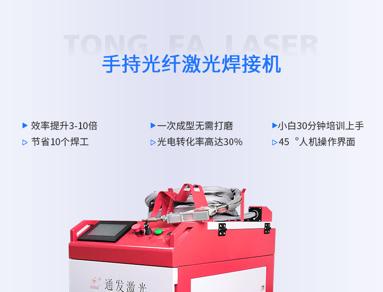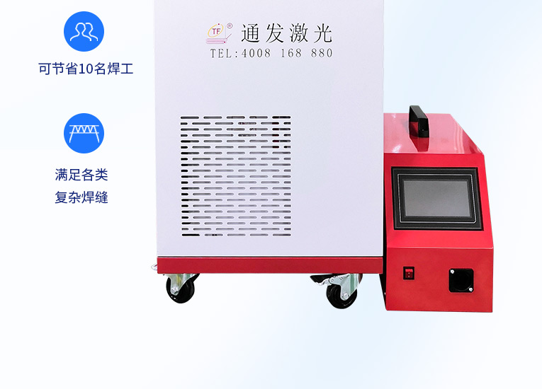 通發(fā)激光一體式手持式激光焊接機,用手持式焊接槍替代以前固定光路,手拿焊接,靈活方便,焊接距離更長,克服工作臺空間的局限性,工件尺寸不統(tǒng)一時無法自動焊接的情況下使用。主要針對大型工件、固定位置如內直角、外直角、平面焊縫焊接、焊接時熱影響區(qū)域小,變形小、而且焊接深度大,焊接牢固。是遠距離焊接大工件的較為靈活的全新的焊接工藝。